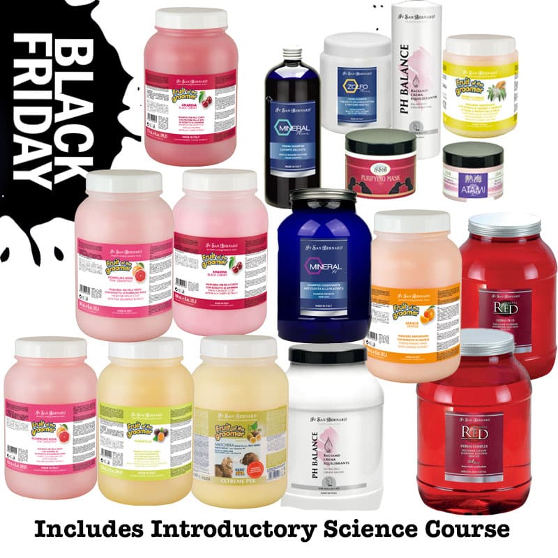 This package includes a a little bit of everything. Package includes: Fruit of the Groomer 3-3250ml Shampoo and 3-3000ml Conditioner Masks (one each of each coat type), 3000ml Mineral Red Derma Complex Shampoo, 3000ml Mineral Red Derma Plus Conditioner Mask, 500ml Purifying Mask Detox, 1000ml Mineral Plus Creme Shampoo, 1000ml Zolfo Plus Cream Shampoo, 3000ml, pH Balance Conditioner Mask, 1000ml Fruit of the Groomer Ginger Elderberry PEK Conditioner Mask, 3000ml Mineral H Shampoo, 3000ml pH Balance Conditioner Mask, 3000ml Fruit of the Groomer Orange PEK Conditioner Mask, and 1-Introductory Science Course Plan Membership at Pet Skin Academy.