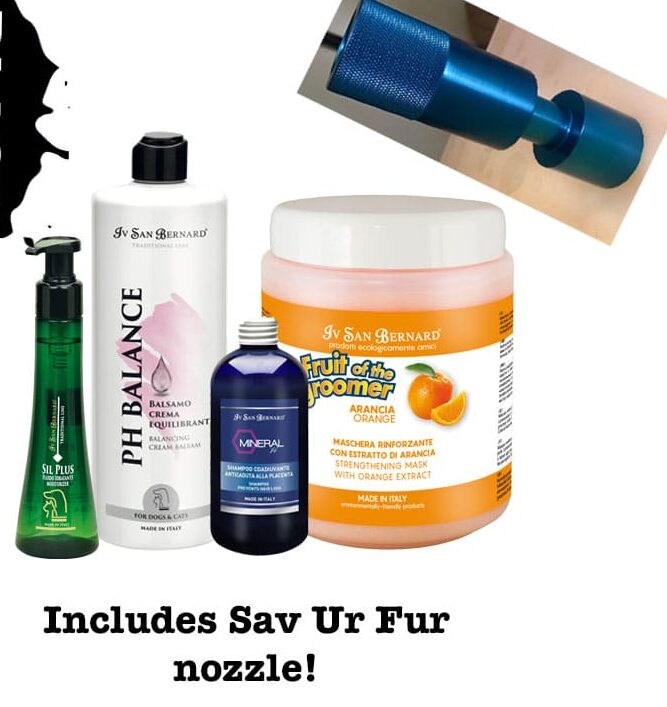The key to a great de-shed is getting as much coat out in the bath as possible. The dead undercoat on an animal is held in by the excess dirt and sebum that has built up on the skin and coat. In order to remove that excess dirt and sebum and release the impacted coat, we are going to use a combination of products and techniques. Using this combination of techniques and products has shown to drop 80-90% of dead undercoat in the tub. Package includes: 250ml Mineral H Shampoo, 500ml pH Balance Conditioner Mask, 1000ml Fruit of the Groomer Orange PEK Conditioner Mask, 100ml Sil Plus White, and a Sav-Ur-Fur Undercoat Nozzle (color varies).